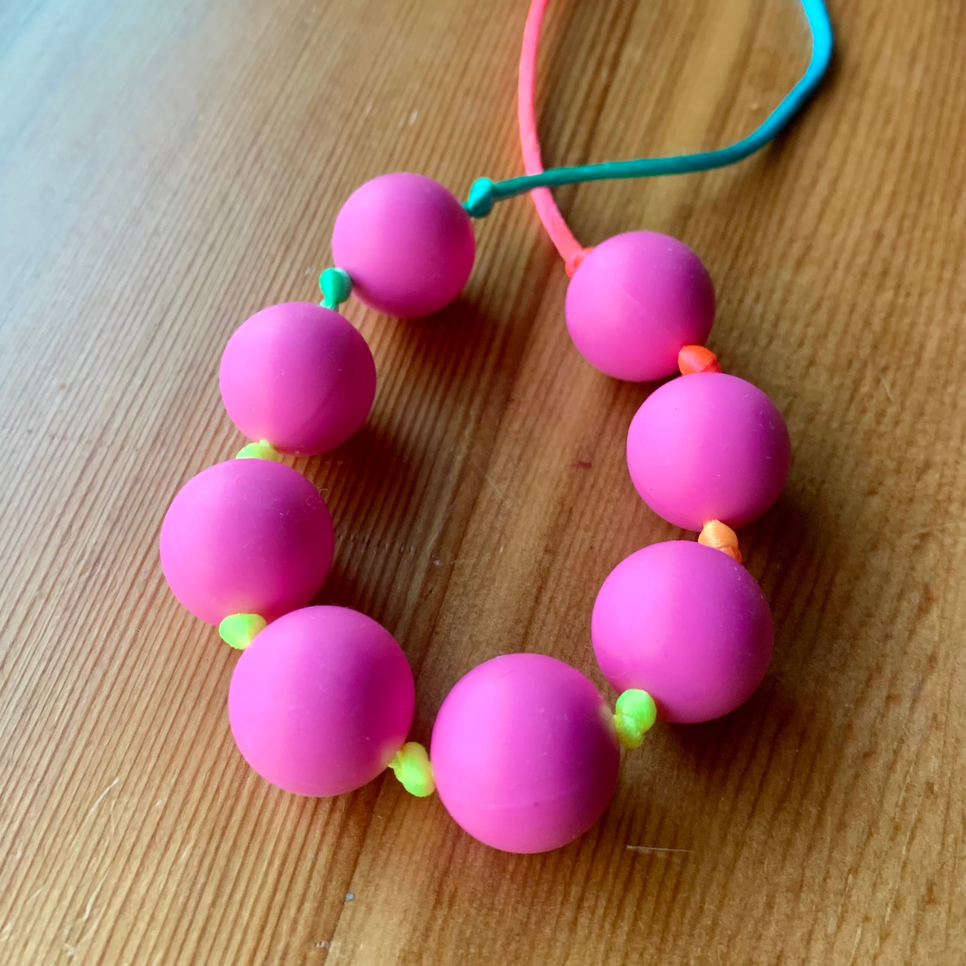 ChewBling Sensory Gumball Chew Necklaces have extra large beads at 18mm round making them a mouthful! It comes on a 22"-28" adjustable length necklace with breakaway clasp.